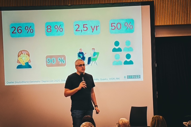 Nach einer kurzen Einführung durch unseren 1. Vorsitzenden Dr. med. Ulrich Walter begann der Referent über seine eigenen Erfahrungen zu berichten, welche er im Rahmen einer schweren Depression und 200 Tagen psychiatrischer Behandlung gemacht hatte. Dabei schaffte es Dr. Reinbacher auf sehr nahbare, authentische Weise und unter Rückgriff auf Passagen aus seinem Buch „Nach Grau kommt Himmelblau“ einen Einblick in die Dramatik des Einbruchs einer psychischen Erkrankung in ein vormals glückliches und aktives Leben zu geben. Nach einer kometenhaften Karriere (Tätigkeiten bei der NASA, McKinsey, Amazon und Google) habe die Depression nicht nur ihn, sondern auch seine gesamte Familie an die Grenzen des Aushaltbaren gebracht. Die Sicht der Angehörigen auf die Erkrankung wurde ebenso deutlich wie die Tatsache, dass eine Depression wirklich jeden treffen kann.