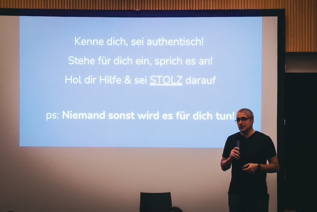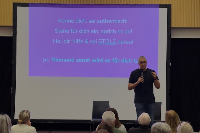 Auf beeindruckende Weise wurden jedoch auch die Möglichkeiten aufgezeigt, angesichts eines solchen Schicksalsschlags, wieder zurück ins Leben zu finden. So schloss die Lesung mit einem „Happy End“: Dr. Thomas Reinbacher hat es mit der Hilfe seiner Familie und professioneller Unterstützung vermocht, einen Weg aus dem Tief der Depression zu finden. Seit dieser Zeit engagiert er sich dafür, das Thema in die Öffentlichkeit zu tragen und Betroffenen wie Angehörigen Mut zu machen, die Hoffnung nicht aufzugeben. Dabei wurde deutlich, dass es möglich ist, selbst aus der ärgsten Krise noch gestärkt hervorgehen zu können.